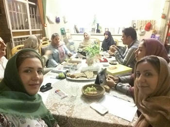 بعد از آن پذیرایی و افطار مختصری فراهم شده بود که با همراهی میهمانان به ضیافتی پر از شیرینی تبدیل شد. بعد از نوش جان کردن چای آتیشی، شیرینی، شلهزرد و نان و پنیر و سبزی، چند آواز گروهی خواندیم. ساعت 9 دوستان یکی یکی رفتند. البته بحث و گفتگو میان دوستان باقیمانده تا ساعت 10 ادامه داشت.