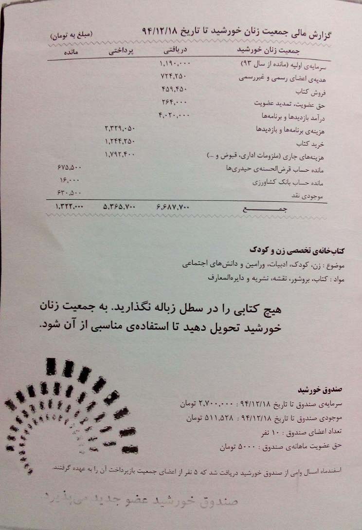 سال 1394 بازار خاطرهها 730.500 تومان درآمد و 124.000 هزار تومان هزینه داشت. سومین بازار خاطرهها 606.500 تومان مانده برای جمعیت زنان خورشید به همراه داشت. در مقایسه با سال گذشته درآمد 252.000 تومان افزایش داشت. هزینه نیز 104.000 تومان افزایش داشت.